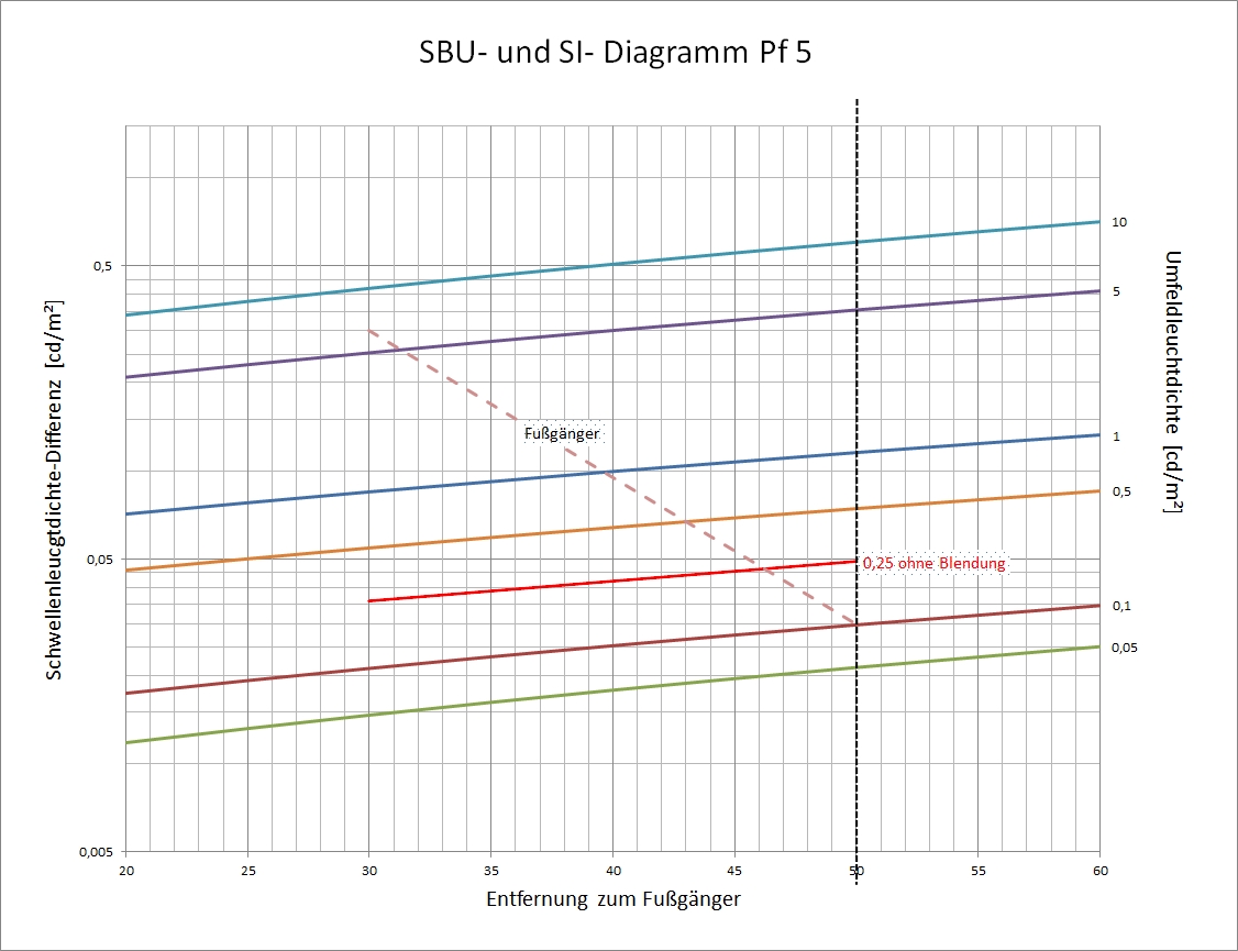 Da sich die Silhouette eines Fußgängers ändert je nachdem ob er von hinten oder von der Seite betrachtet wird, muss der unterschiedliche Sehwinkel berücksichtigt werden. Wenn das Sehobjekt ein Fußgänger mit bekannten Abmessungen ist, dann kann aus den Berek´schen Kurven ein sogenanntes SBU-Diagramm erstellt werden.