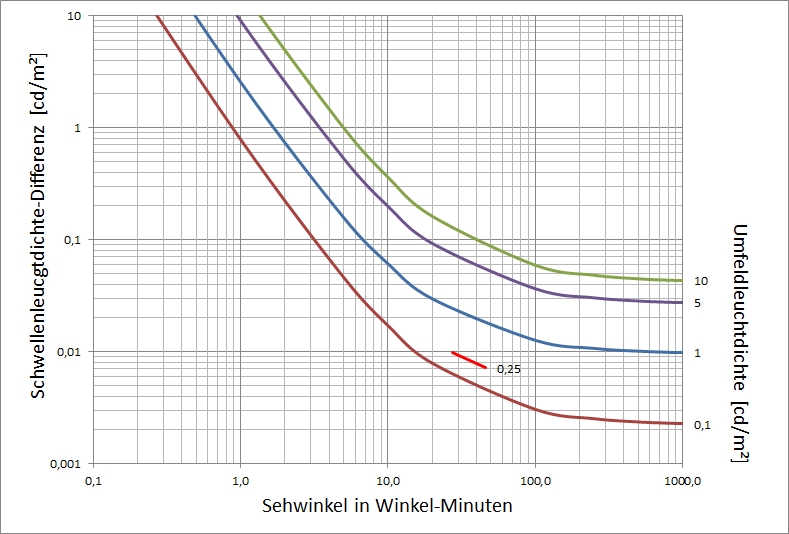Aus den Berek'schen Kurven kann abgelesen werden welche Schwellenleuchtdichtedifferenz zwischen dem Objekt und dessen Umgebung vorliegen muss, damit ein Objekt mit einem bestimmten Sehwinkel und bei einer bestimmten Umgebungsleuchtdichte erkennbar ist. Diese Kurven geben somit die erforderlichen Leuchtdichtedifferenzen in Abhängigkeit vom Sehwinkel und von der Umgebungsleuchtdichte an.